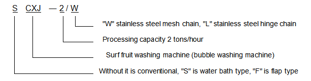 CXJ type surf fruit washing machine is composed of water tank components, bubble device, anti-settling net, washing filter device, spray cleaning device, discharge hoist and control box (see the structure diagram for details); SCXJ type water bath surf washing machine It is composed of water tank components, bubble device, spray cleaning filter device, conveying hoist and control box (see the structure diagram for details); FCXJ type flip surfing cleaning machine is composed of water tank components, bubble device, anti-settling net, flushing filter device, Plate turning device, spray cleaning device, discharge hoist and control box, etc. (see structure diagram for details);