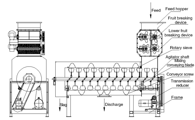 Working principle: The pomegranate enters the upper fruit breaking device from the feeding hopper, and is pressed open and coarsely broken under the action of the opposing pressure between the two pressure rollers The fruit then enters the lower fruit breaking device, and the lower fruit breaking device squeezes the pomegranate again. At this time, the pomegranate that has undergone two-stage squeezing has basically separated its shell and flesh and falls into the separating device. The upper and lower fruit breaking rollers are of elastic structure, and the gap is adjustable. Under the action of the mixing and conveying blades on the mixing shaft, the broken pomegranate pulp drops from the sieve holes and is sent to the discharge port under the action of the spiral outside the rotating sieve, while the pomegranate skins are discharged from the tail under the action of the mixing and conveying blades. The pomegranate pulp and juice from this machine can be transported to the next process with a screw pump.