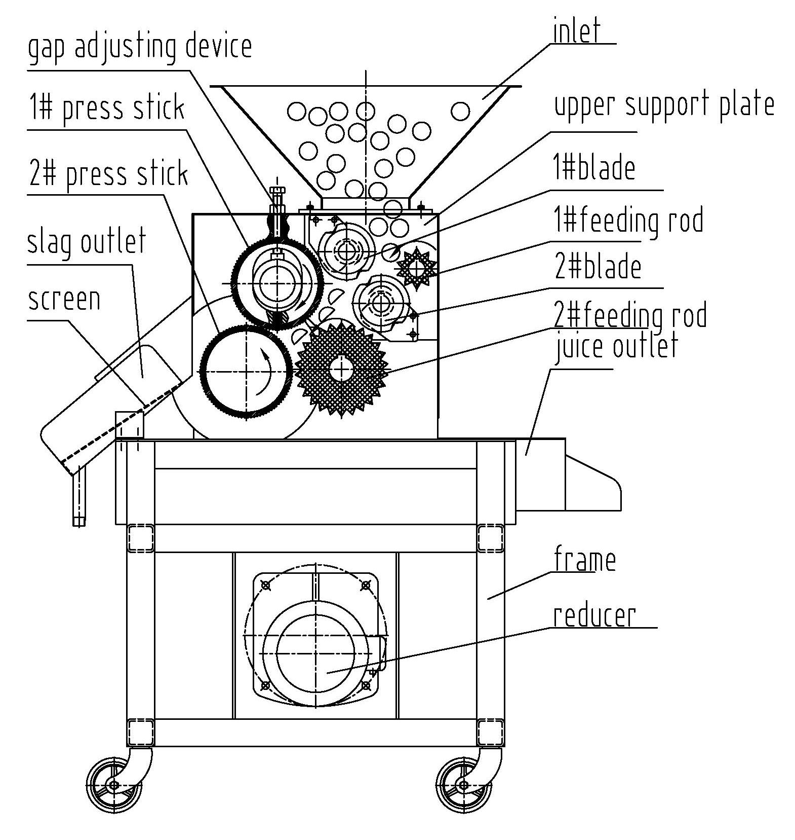 This machine is made of frame、reducer、inlet、two sets of blades, two sets of feed roller, two groups of press roller , the juice outlet, slag outlet and other components. the main working principle: turn on the power, the material into the hopper, 1 # feed roller auxiliary feed, 1 # and 2 # two blade slices of fruit, and then 2 # feed roller put the fruit into1 # press roll and 2 # press roll to extract the juice.(1 # press roller can be adjusted up and down by the gap device to control the amount of fruit juice),Juice and part of the pulp from the juice outlet discharge, peel and slag from the hopper discharge, so as to achieve the purpose of juice. The equipment is made of all stainless steel except the transmission parts.